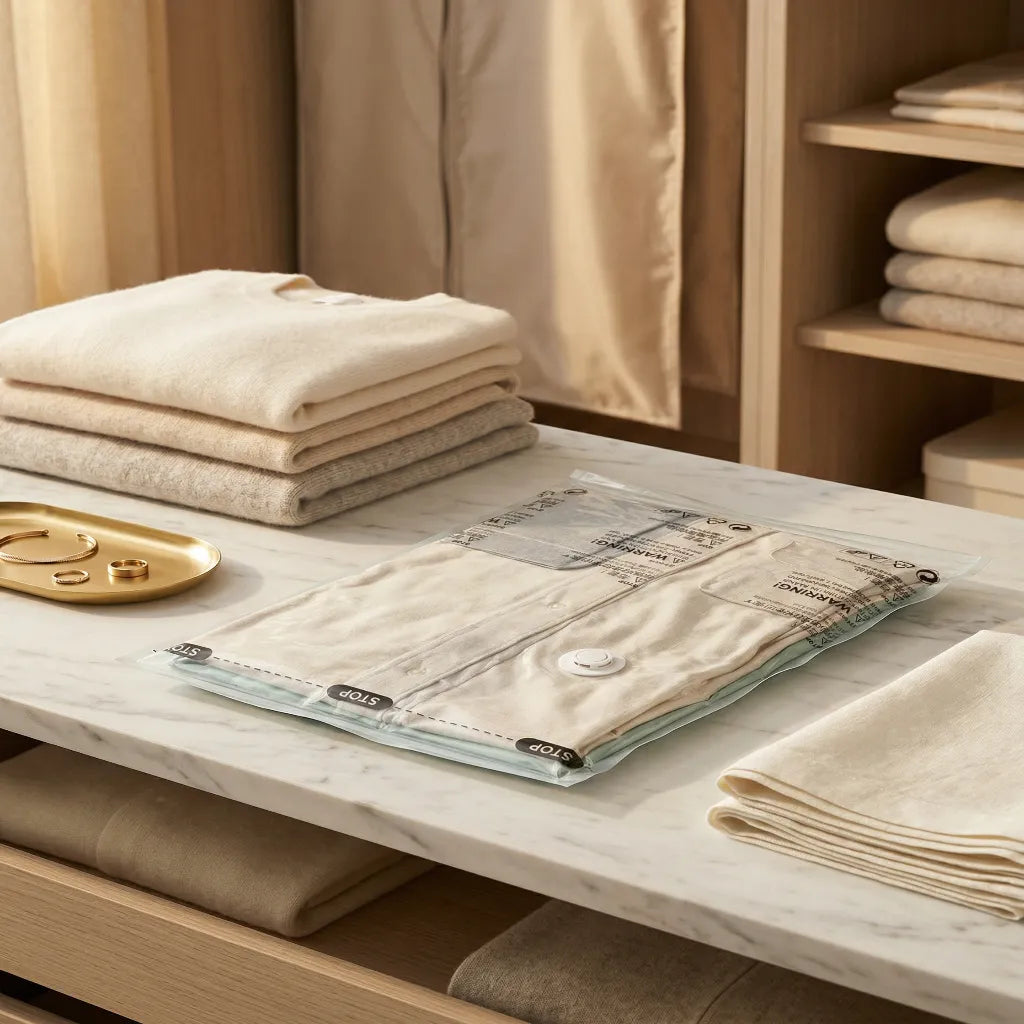 Carrément! Transformez vos tiroirs et placards débordants en havres de paix organisés. Les sacs Kianore compressent vos affaires pour libérer un espace précieux, donnant à votre appartement une allure épurée et luxueuse.